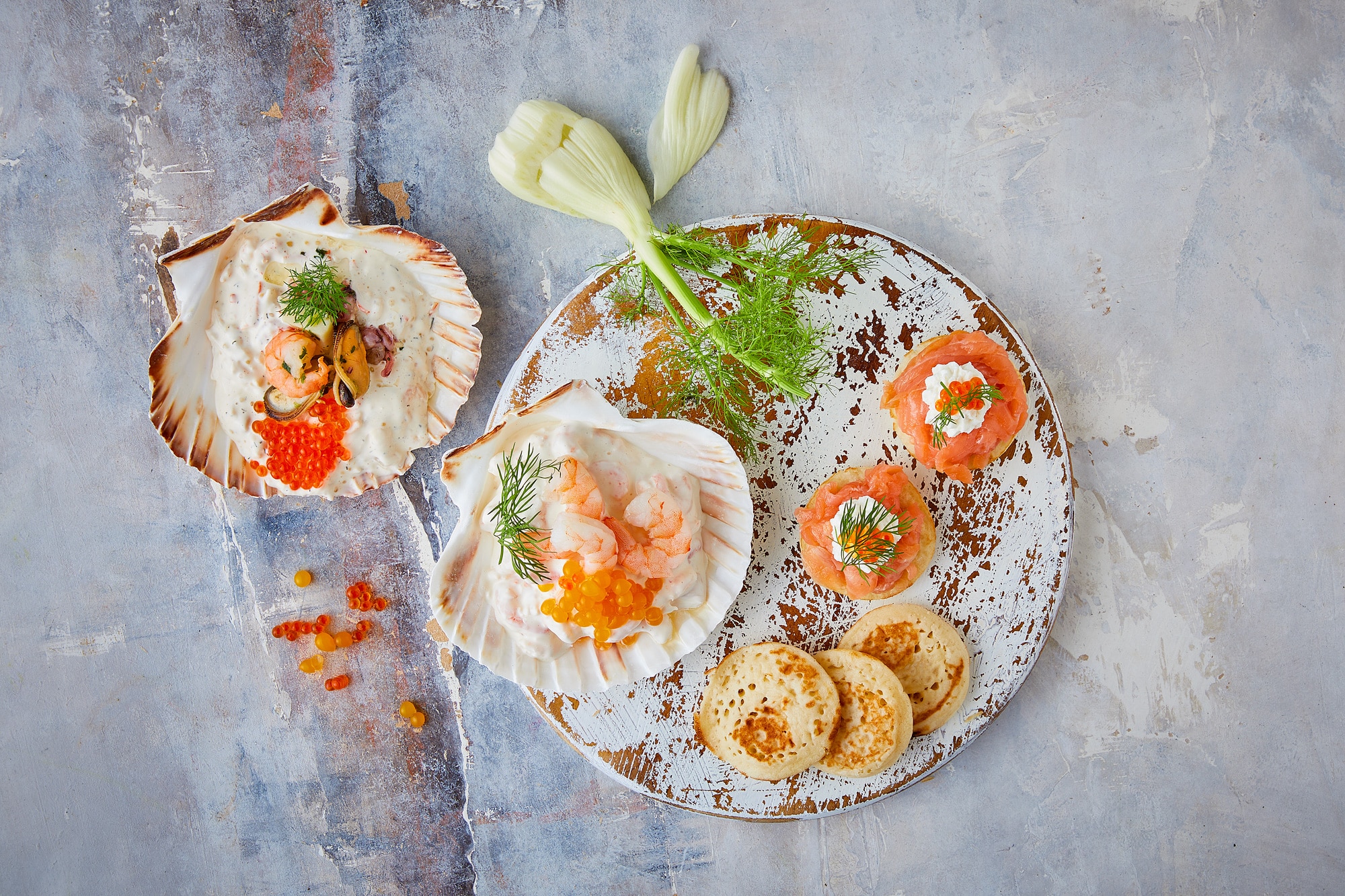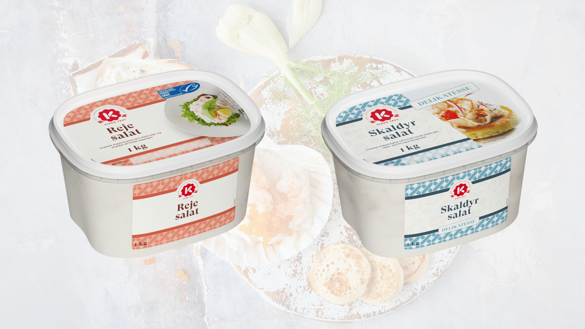 Her har vi brugt vores K-Salat Skaldyrssalat Delikatesse og K-Salat Rejesalat, begge i 1 kg bægre. Serveringen kan pyntes efter smag og fantasi – og passer perfekt til en buffet. Samtidig er det en løsning, der både er enkel og budgetvenlig.