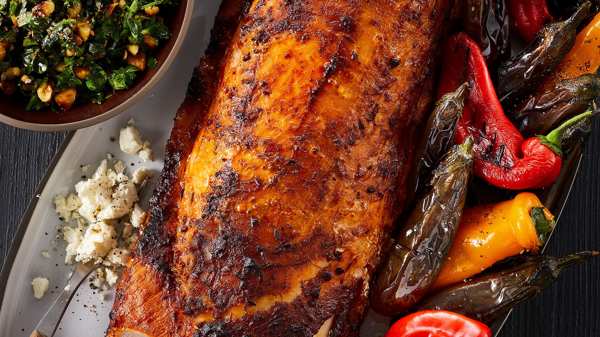 Chipotle og ahornsirup marineret kamfilet med grillet aubergine og peberfrugt, chimichurri og fetaost