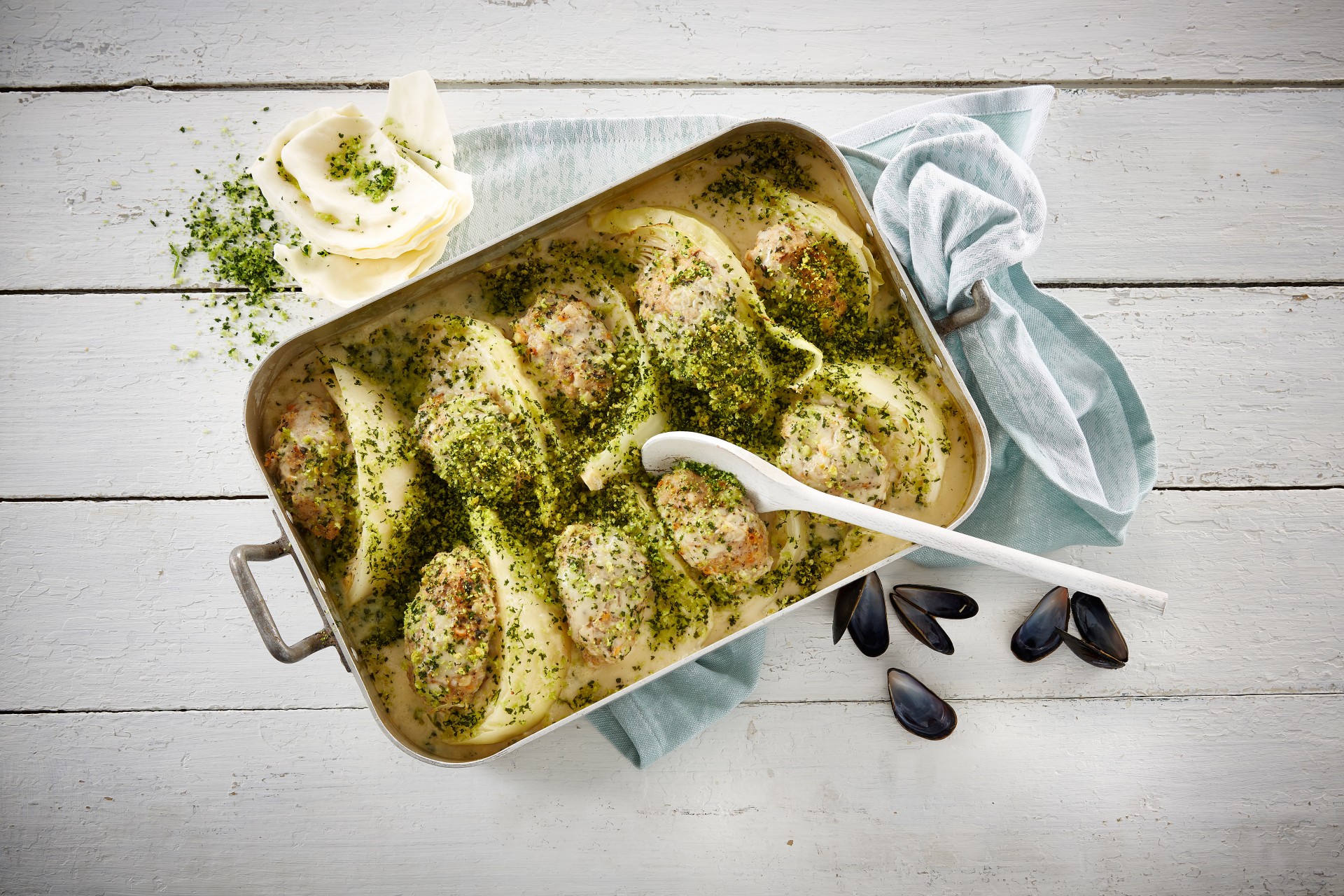 Farseret hvidkål med blåmuslinger og grøn krumme