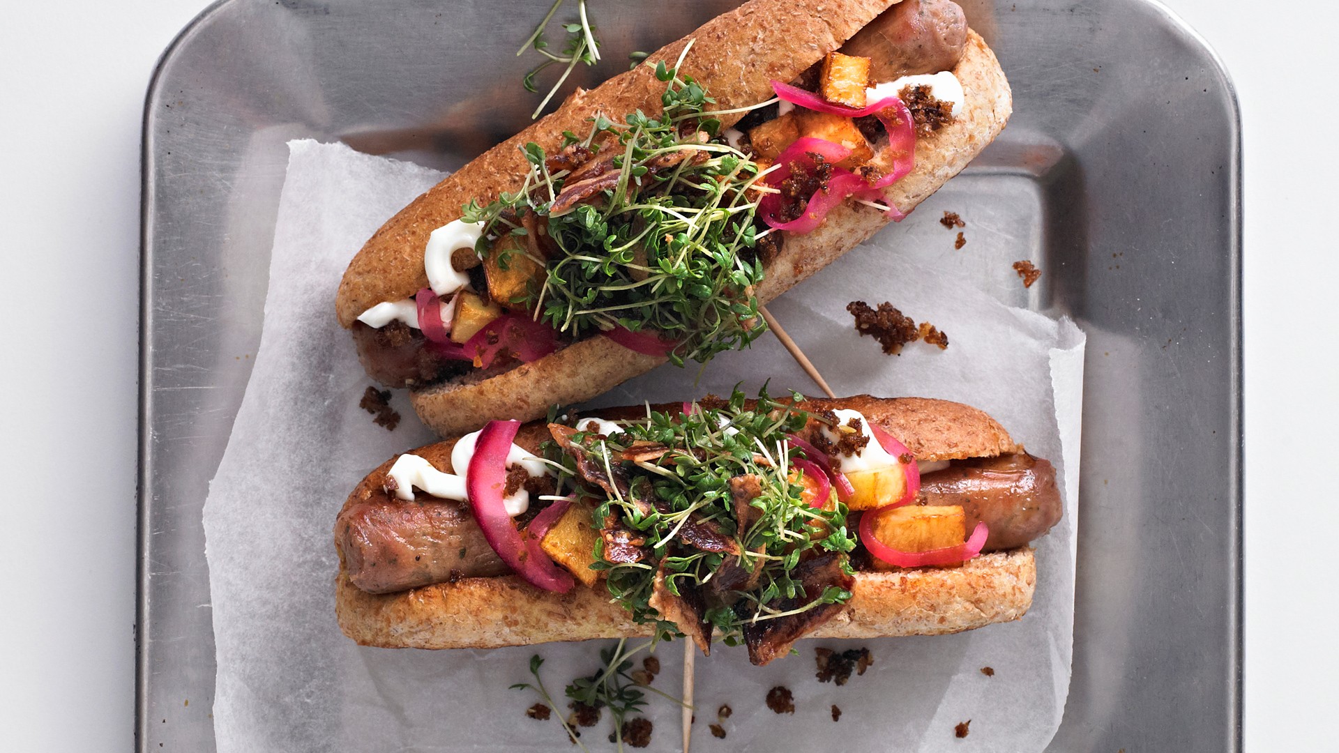 Rist baconen af og lad det køle ned. Bland med karsen og drys det henover hotdoggen til allersidst.