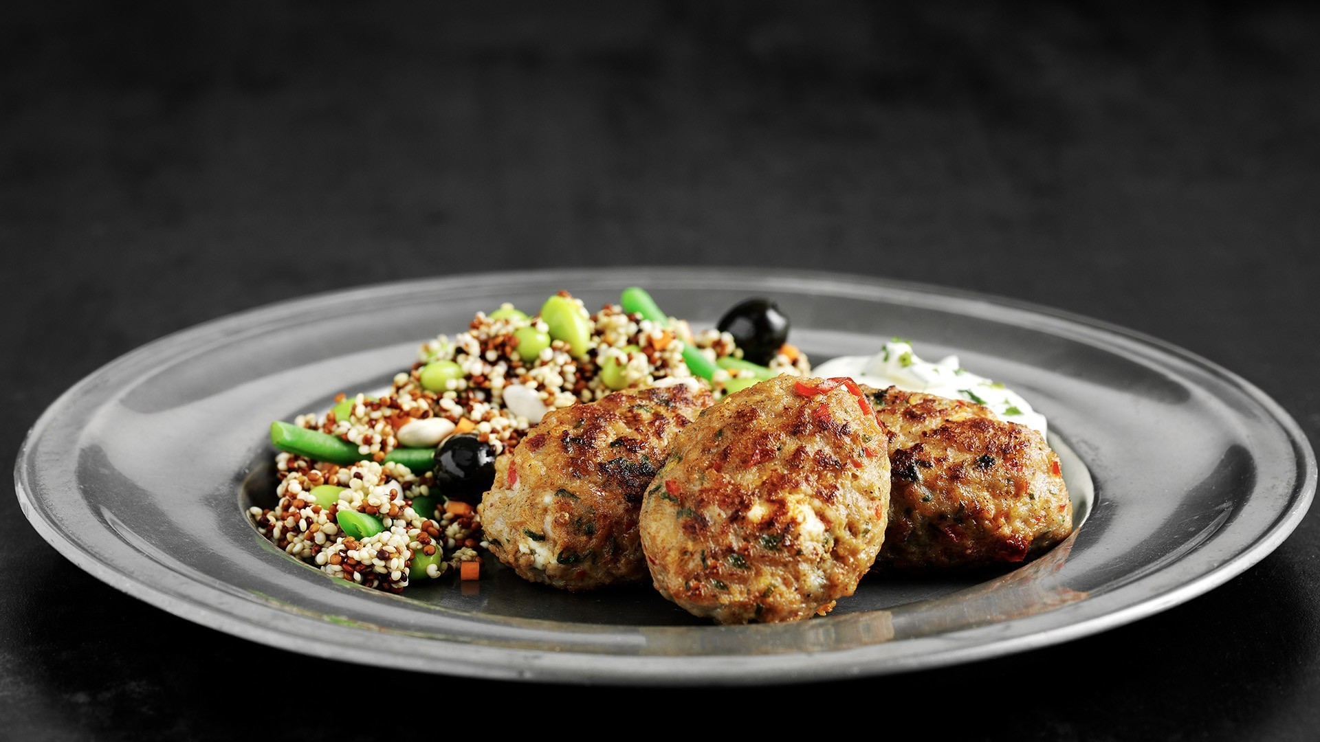 Krydrede Frikadeller med vild quinoa og creme fraiche