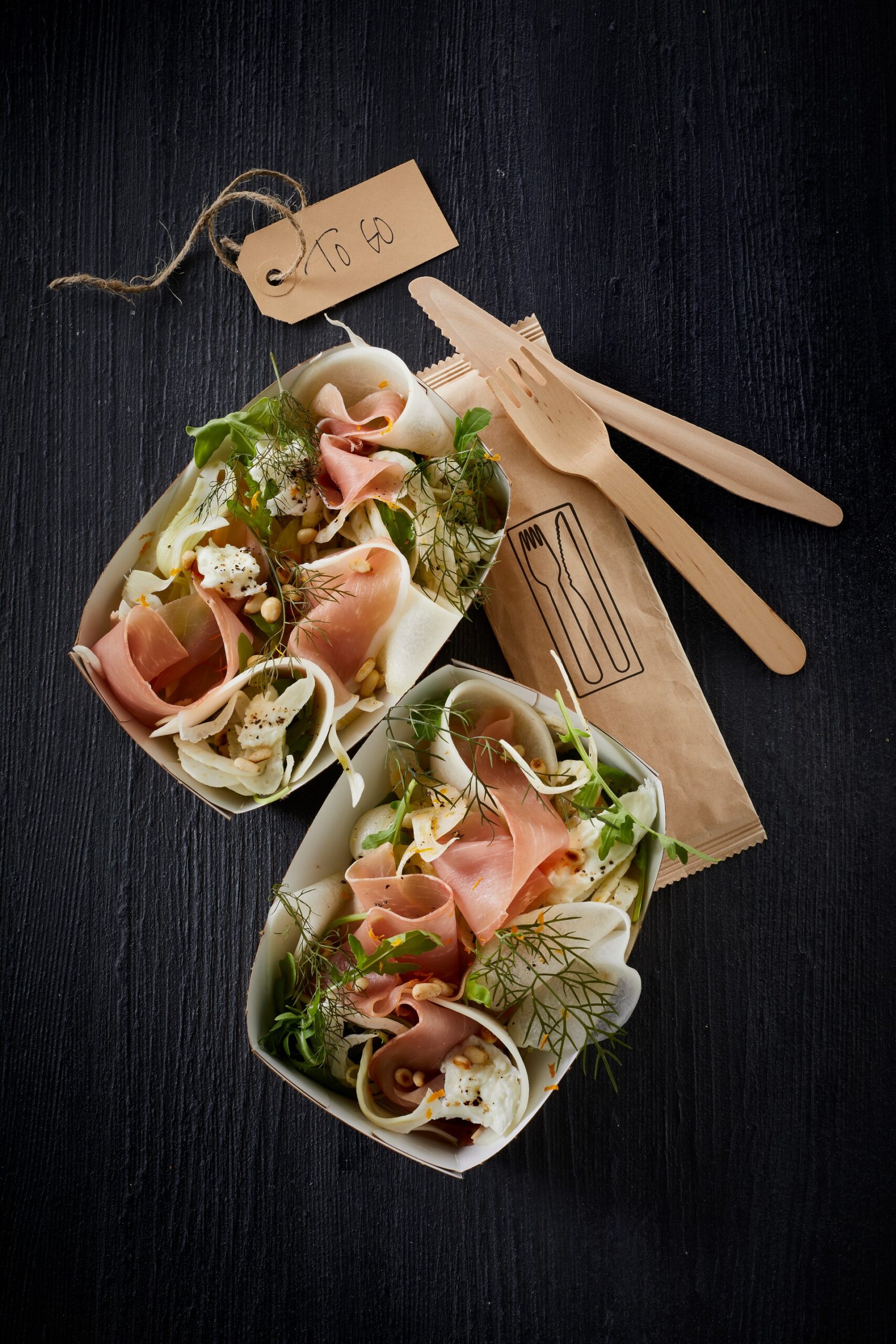 Lufttørret skinke i melonsalat med fennikel, rucola og mozzarella