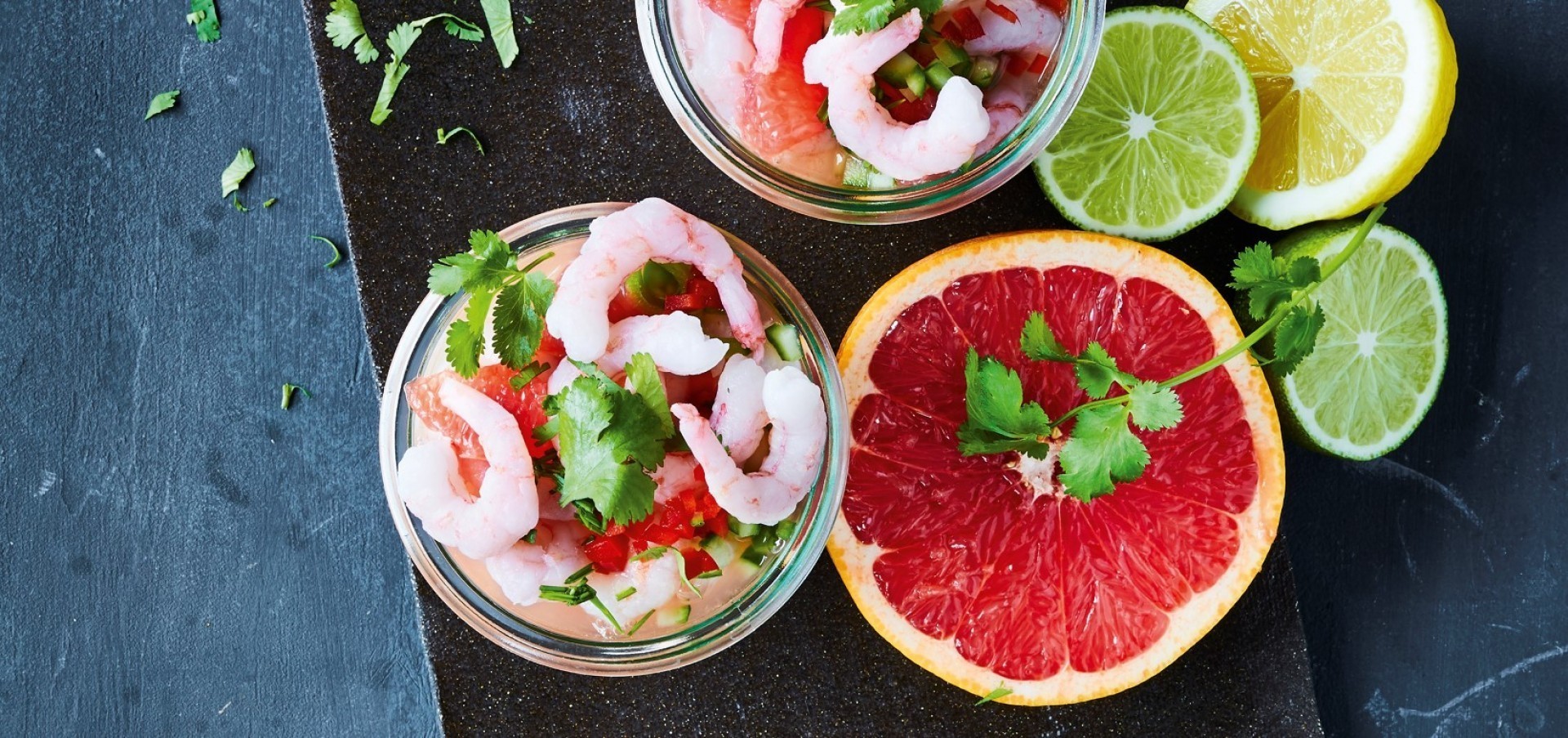 Vend rejerne med grape-/limesaften, agurk, peberfrugt, sugarsnaps, grapefileterne og friskhakket koriander og server straks.